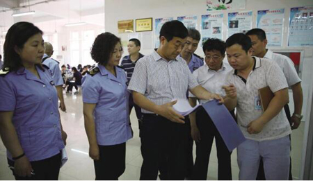 鄭州市食藥監(jiān)局副局長劉涪江  (左三)在鄭州第二中學食堂進行檢查